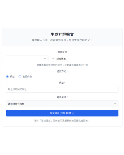 自動產出社群貼文、排程發佈、圖文整合,讓你的 Facebook、IG、Threads 經營不再苦惱。一鍵生成貼文、靈感不再枯竭,是你行銷團隊的超級助手!